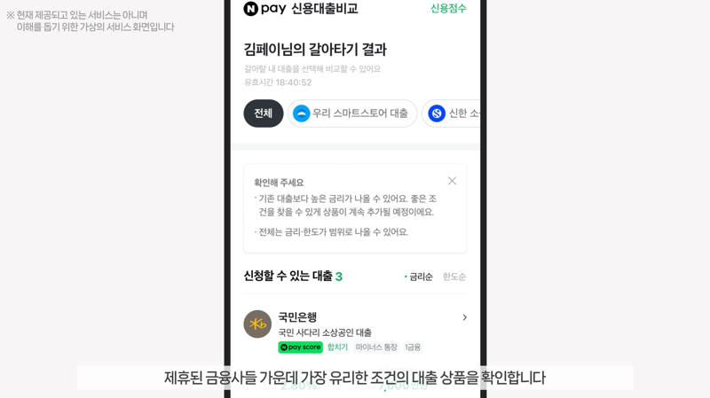 시연 영상에서는 개입사업자 대출 갈아타기와 금리인하요구권 자동신청 서비스의 절차를 안내했다. 네이버페이 마이데이터 화면에서 소상공인이 금리인하요구권을 신청할 대출을 선택하고, 마이데이터 사업자가 금리인하요구권을 대행할 수 있도록 동의하면 금리인하요구권 신청이 접수된다. 이후 은행의 심사 결과에 대해 네이버페이가 알림으로 알려주는 방식이다. 여기에 추후 금리인하 가능성이 탐지되면 자동으로 재신청되고, 심사 결과가 다시 알림으로 안내된다.