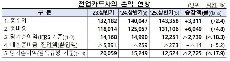 5일 금융감독원에 따르면 올해 상반기 8개 전업 카드사 당기순이익(IFRS 기준)은 1조2251억원으로 집계됐다. 전년 동기(1조4990억원) 대비 18.3%(2739억원) 감소한 수치다.