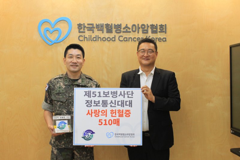 육군 제51보병사단 정보통신대대는 4일 부대 내 나눔헌혈동아리 장병들이 모은 헌혈증서 510장을 한국백혈병소아암협회에 전달했다고 밝혔다.