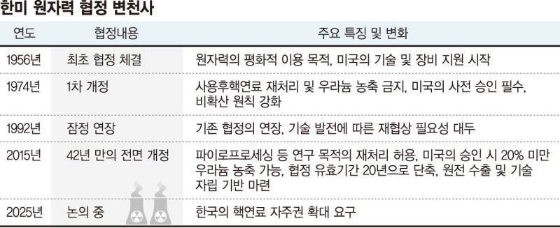 미국이 우리나라의 농축우라늄과 재처리 기술 확보에 반대해온 것은 핵무기 개발에 대한 우려 때문이다. 90% 이상의 고농축 우라늄과 재처리 과정에서 발생하는 플루토늄은 핵무기 개발의 핵심 원료로 사용이 가능하다. 하지만 우리나라는 지난 수십년간 원자력을 평화적으로 이용해 왔다는 점에서 우라늄 농축과 재처리 허가를 받아야 한다는 주장이 제기된다.