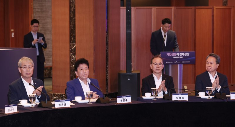 4일 대한상공회의소와 한국경제인협회, 한국중견기업연합회가 서울 중구 롯데호텔에서 개최한 '기업성장포럼 출범식'에는 KB·신한·하나·우리금융지주 회장이 모두 참석했다. 이 자리에서 산업계는 정부에 낡은 규제 장벽을 허물고 '성장하는 기업에 보상이 돌아가는 제도'를 마련해야 한다고 촉구했다.