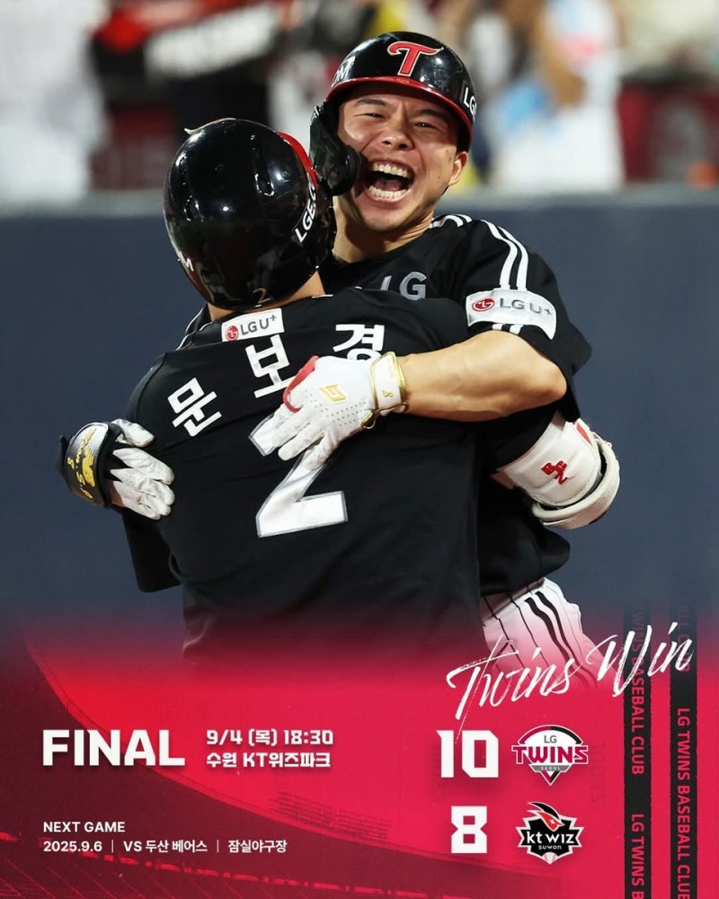 LG는 4일 경기도 수원시 케이티위즈파크에서 열린 kt wiz와 원정 경기에서 10-8로 이겼다.