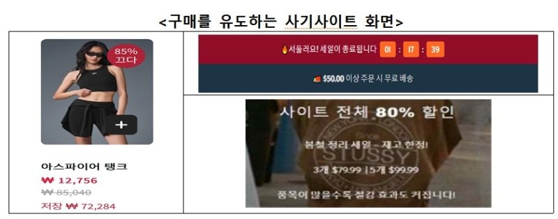 사칭 사이트는 공식 홈페이지의 브랜드로고, 메인화면 구성, 상품 소개를 그대로 사용했고 '80% 세일', '당일 한정', '무료배송' 등의 표현으로 소비자의 구매를 유도했다.