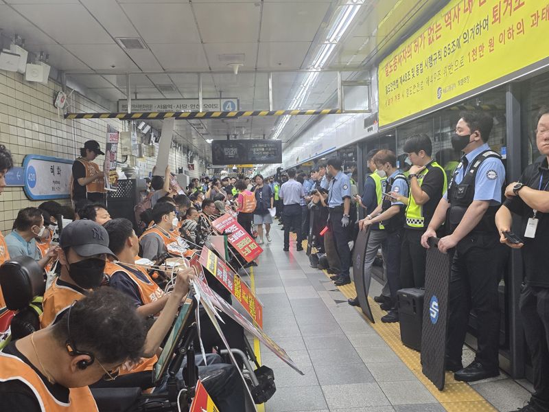 전장연은 이날 오전 남태령역과 선바위역, 혜화역 등에서 장애인 권리 예산 편성을 촉구하며 '출근길 지하철 탑니다' 시위를 진행했다.