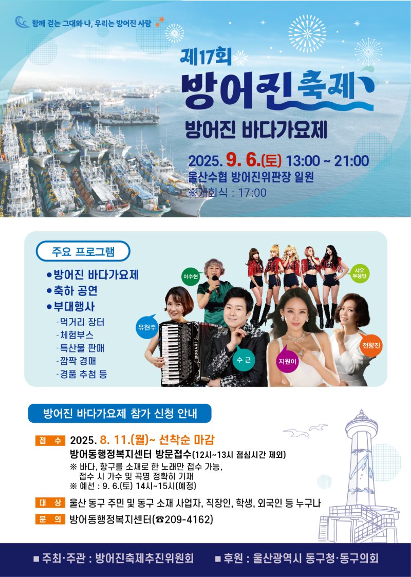 바다와 항구를 주제로 한 방어진 바다가요제, 체험부스, 깜짝 경매 후 프로댄스팀 공연, 초청가수 공연이 예정돼 있다.