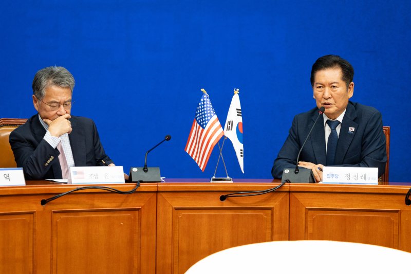 (서울=뉴스1) 서미선 임윤지 기자 = 정청래 더불어민주당 대표는 5일 조셉 윤 주한미국 대사대리를 만나 "미국 대통령이 꽉 막힌 남북 관계 평화의 시기를 다시 되돌릴 수 있는 피스메이커가 됐으면 좋겠다는 게 국민 바람"이라며 "미국의 역할을 기대한다"고 말했다.