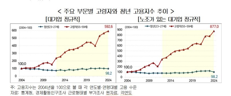 노조가 있는 대기업 정규직 내 고령자 고용의 경우 같은 기간 777% 늘어났지만, 청년 고용은 1.8% 줄었다. 고령자 고용 비중은 2004년 2.7%에서 2024년 10.7%로 8%p 증가해 청년 고용 비중을 넘어섰다. 같은 기간 청년 고용 비중은 13.6%에서 6%로 줄었다.