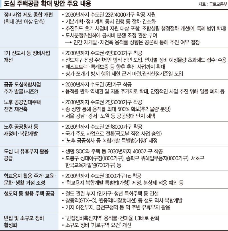 정부의 도심 주택공급 확대 방안은 한마디로 '모든 가용 수단'을 동원한 것이다. 서울 서초구 한국교육개발원(700가구) 및 학교·철도용지 등 유휴부지 개발부터 1기 신도시 주민제안 방식 전면 도입, 재개발·재건축 사업기간 3년 이상 단축, 노후 공공임대 전면 재건축, 공공 도심복합사업 신규 발굴 등 그간 논의 및 거론됐던 방안이 다수 포함됐다. 일각에서는 백화점식 나열 대책이라는 지적도 나오고 있다.