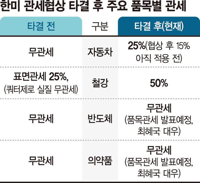 관세협상은 타결됐지만 세부 항목을 따지면 여전히 불확실성이 많다. 우선 한국은 합의한 자동차 관세 15% 인하를 아직 문서화하지 못했다. 지난달 25일 한미 정상회담 준비 과정에서 문서화를 시도했지만 이견으로 불발됐다.