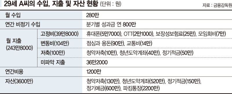 A. 29세 A씨 월 수입은 280만원이다. 연간 비정기 수입은 분기별 성과금 800만원이 들어온다. 월 지출은 243만8000원이다. 고정비가 휴대폰(5만7000원), OTT(2만1000원), 보장상보험료(25만원), 모임회비(7만원) 등 39만8000원이다. 변동비는 점심과 용돈(90만원), 교통비(14만원) 등 총 104만원이다. 저축은 청약저축(10만원), 청년도약계좌(40만원), 정기적금(50만원) 등 100만원씩 하고 있다. 미파악 지출은 36만2000원인데, 남는 자금 일부는 파킹통장에 넣어두고 있다. 연간 비용은 1200만원이다. 자산은 청약저축(130만원), 청년도약계좌(520만원), 정기적금(150만원), 정기예금(600만원), 파킹통장(2200만원) 등 총 3600만원이다.