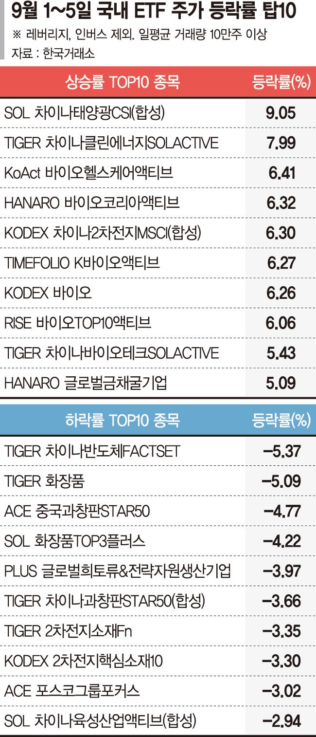 국내 상장지수펀드(ETF) 시장에서 중국과 바이오 관련 상품이 동반 강세를 보인 반면, 화장품과 일부 이차전지 ETF는 단기 차익실현 매물 출회로 조정을 받았다. 전문가들은 중국 경기 부양책과 글로벌 헬스케어 투자 심리 등으로 상승세가 이어지고 있다고 진단했다. 화장품과 이차전지 업종의 경우 그동안 가파른 상승세를 감안할 때 숨고르기 국면일뿐 반등 여지는 충분하다고 분석했다.