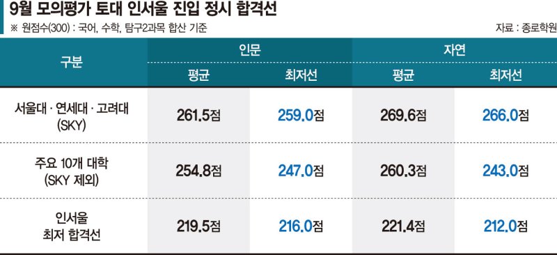 2026학년도 9월 대학수학능력시험 모의평가 가채점 결과, 국어·수학·탐구 영역 원점수 300점 만점을 기준으로 서울에 있는 대학의 최저 합격선은 인문계열 216점, 자연계열 212점으로 예측된다고 7일 종로학원이 분석했다. 또 서울대·연세대·고려대(SKY)의 최저 합격선은 인문 259점, 자연 266점으로 예상했다.