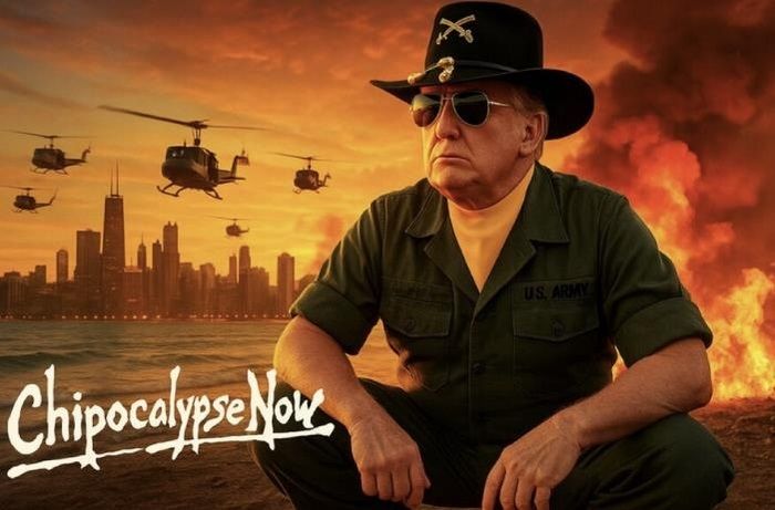 트럼프 대통령은 지난 6일(현지 시각) 자신의 SNS에 ‘치포칼립스 나우(Chipocalypse Now)’라는 제목의 합성 이미지를 올렸다. 이는 영화 지옥의 묵시록(Apocalypse Now)의 원제와 시카고(Chicago)를 결합한 표현으로 추정된다.