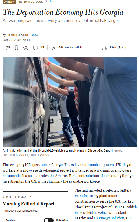 [파이낸셜뉴스] 미국 조지아주의 현대차와 LG엔솔 공장 건설 현장에서 475명이 당국에 연행된 것에 대해 미 유력 경제지 월스트리트저널(WSJ)은 모든 기업들의 미국 이민세관단속국(ICE)의 표적이 될 수 있음을 보여주고 있다고 7일(현지시간) 사설에서 밝혔다.