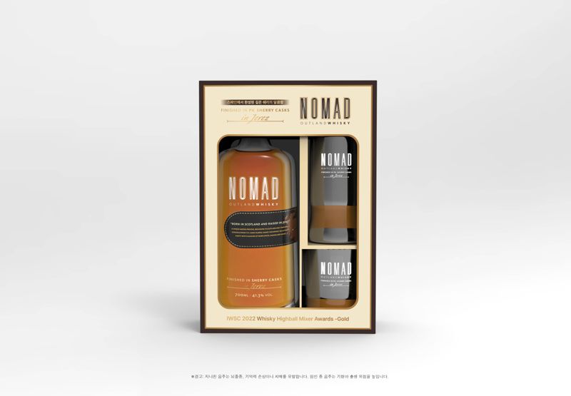 이번에 새롭게 선보이는 패키지는 노마드 1병, 온더록스 전용잔 1개, 하이볼 전용잔 1개로 구성됐다.