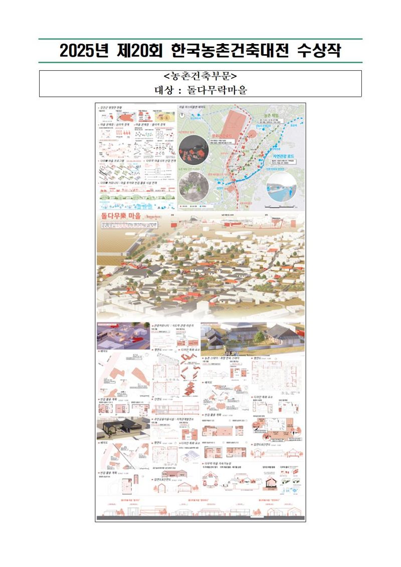 수상작은 오는 25일부터 28일까지 서울 aT센터에서 열리는 ‘2025 대한민국 농업박람회’ 특별전시회를 통해 일반에 공개된다. 아울러 국민 누구나 손쉽게 감상하고 농촌 홍보에 활용할 수 있도록 공모전 홈페이지에도 게재될 예정이다. 농촌건축 및 계획 부문 우수작 16점은 작품에 담긴 농촌 발전 아이디어가 실제 지역 개발사업과 정책에 활용될 수 있도록 전시 이후 해당 지자체에 제공될 예정이다.