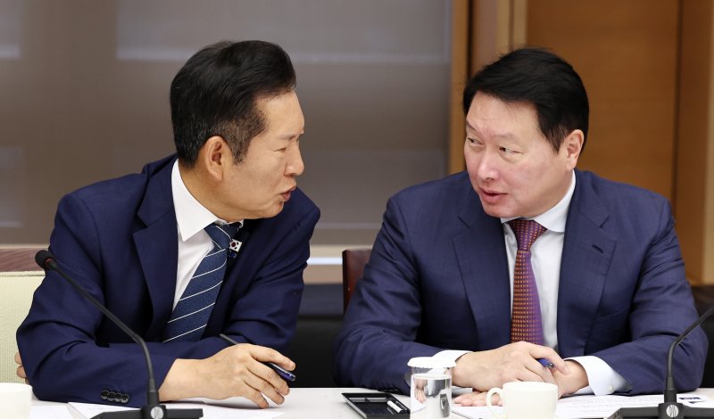 이에 정 대표는 대한상의 등 경제계가 요청하고 있는 규제 완화 등에 대해 바로바로 피드백을 하겠다고 강조했다. 그는 "최태원 회장께서 말씀하신 기업 사이즈별 별 계단식 규제로 인해 규제를 피하느라 성장도 피한다는 지적이 참 크게 가슴에 와닿았다"면서 "기업이 스스로 성장할 수 있도록 시장에서의 안전장치와 보상을 제공하는 것이 핵심이라는 말씀에 전적으로 공감한다"고 했다.