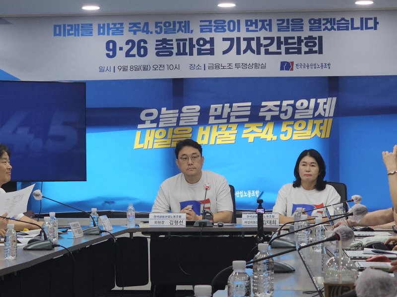금융노조는 8일 오전 10시 서울 중구 금융노조 투쟁상황실에서 9.26 총파업 기자간담회를 열고 주 4.5일제 전환에 대한 결의를 전달했다.