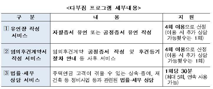 이 프로그램은 △유언장 및 임의후견계약서 작성 △상속과 증여 △담보주택의 재건축 등에 따라 주택연금 고객들이 궁금해 하는 법률과 세무 관련 내용에 대해 법무법인(로고스)을 통해 무료 상담 받을 수 있도록 한 게 골자다. 예산 소진 시까지 운영된다.