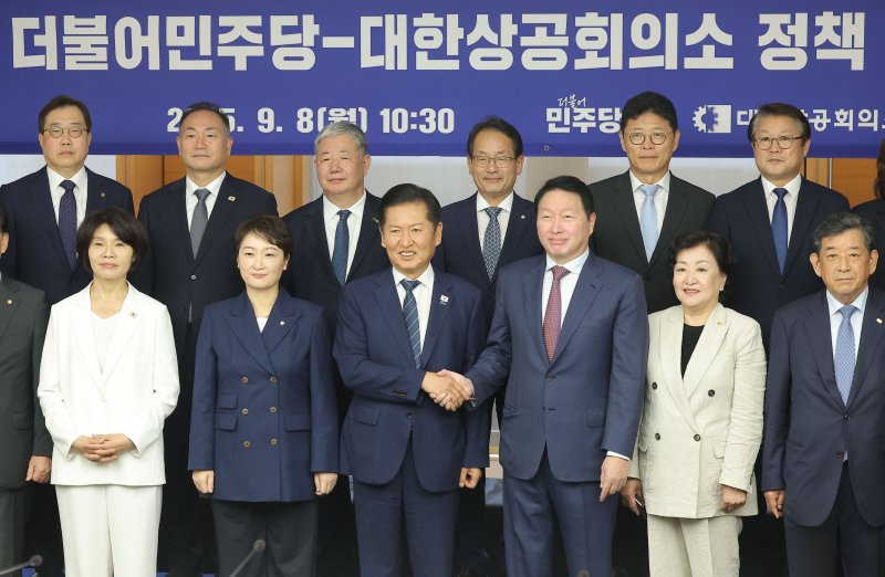 [파이낸셜뉴스] 정청래 더불어민주당 대표는 8일 대한상공회의소를 찾아 최근 미국 조지아주 현대차그룹·LG에너지솔루션 배터리 공장 건설 현장에서 한국인 300여명이 구금된 사태와 관련해 "근본적으로 비자 문제를 해결 할 수 있도록 정부와 협력해서 잘 풀릴 수 있도록 노력하겠다"고 밝혔다. 경제계의 규제 완화 등 건의사항에 대해선 신속한 피드백을 약속했고, 여당과 대한상의가 3개월마다 정례적으로 만나 소통 협력을 강화하자고도 했다.