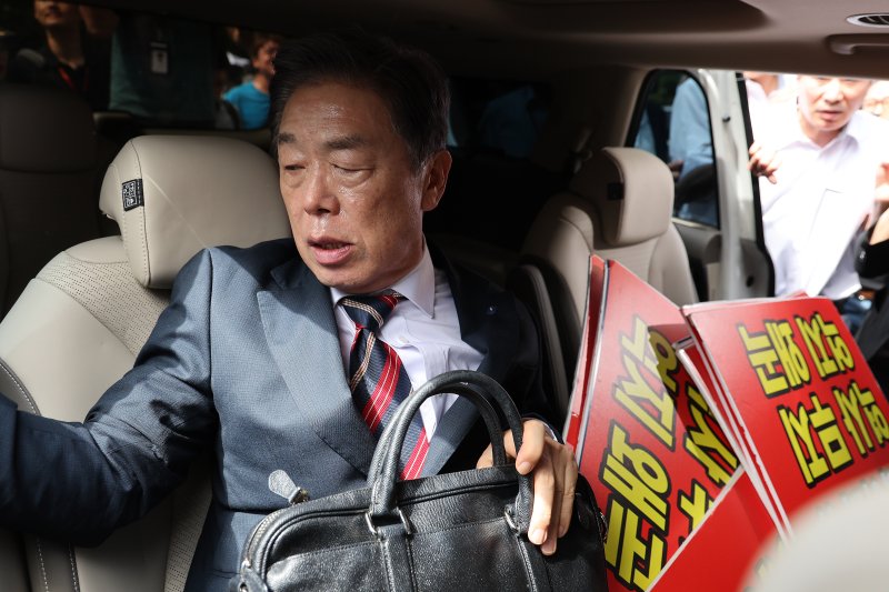 문진석 민주당 의원은 차량 문을 붙잡으며 “그동안 언행뿐 아니라 오늘 기자회견도 공공기관장으로서 적절치 않다. 사과하라”고 촉구했다.