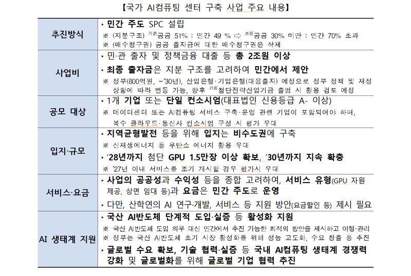 정부가 원할 때 공공이 냈던 투자금을 민간 사업자가 토해내는 매수청구권(바이백) 조항도 삭제하기로 했다. 또한 2030년까지 국가 AI컴퓨팅 센터 내 국산 AI 반도체(NPU 등) 비중을 50%로 끌어올리려 했으나, 민간에서 국산 AI 반도체의 성능, 활용성 등이 검증되지 않았다는 지적에 따라 이를 의무화하지는 않기로 했다.