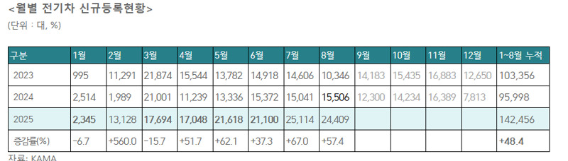 한국자동차모빌리티산업협회(KAMA)가 8일 발표한 '2025년 1~8월 국내 전기차 시장 동향'에 따르면, 지난 8월까지 국내 전기차 판매량은 총 14만2456대로 지난해 같은 기간보다 48.4% 급증했다. 지난해 연간 전기차 판매량이 14만6734대라는 점을 고려하면 이달 중 지난해 판매량을 무난히 뛰어넘을 전망이다.
