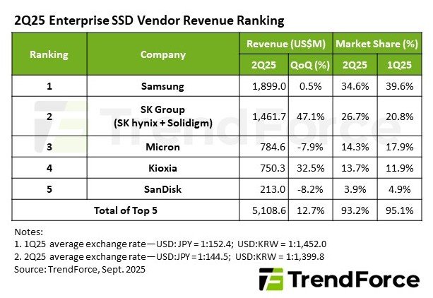3위 마이크론의 2분기 기업용 SSD 매출은 7억8460만 달러(1조원)다. 점유율은 14.3%로 삼성전자 및 SK하이닉스와는 여전히 격차가 크다.