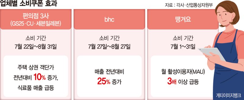 중소 가맹점이 많은 외식업계도 소비쿠폰 효과를 톡톡히 보고 있다. 7월 27일부터 8월 27일까지 한 달간 치킨업체 bhc 매출은 전년 대비 25% 증가했다. 교촌치킨도 소비쿠폰 지급 후 한달간 주문건수가 전년 동기 대비 5% 늘었다. 가맹점주 위주로 운영되는 피자, 커피, 버거 브랜드도 매출 증가 효과가 있었다.