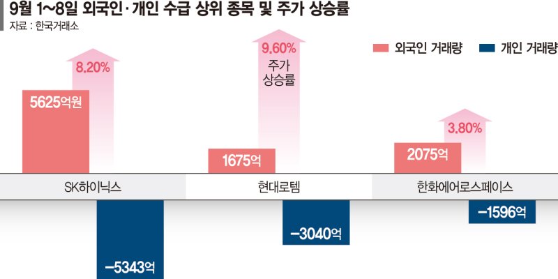 주가는 오름세를 탔다. SK하이닉스는 이달 1일 25만6000원에서 8일 27만7000원으로 8.2% 상승했다. 현대로템도 같은 기간 19만2000원에서 21만500원으로 9.4% 뛰었고, 한화에어로스페이스는 91만6000원에서 95만1000원으로 3.8% 올랐다. 외국인이 집중 매수한 종목들이 일제히 강세를 나타내면서 '수급=성과' 공식이 확인됐다. 반대로 개인은 주도주를 덜어냈다가 수익률 확대 기회를 고스란히 놓치는 분위기다.