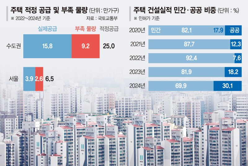 민간 역할 축소도 우려되는 대목이다. 2015~2024년 주택 건설실적을 분석한 결과 인허가 기준으로 공공 비중은 평균 10%대이다. 주택경기 침체로 민간이 부진을 겪었던 지난 2024년 30.1%가 최고 수치였다. 한마디로 주택공급의 90%를 민간이 담당하고 있는데 '공공'에만 초점을 맞춘 대책인 셈이다.