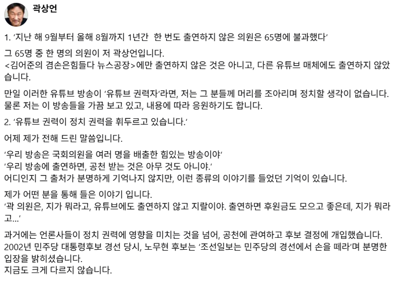 [파이낸셜뉴스] 곽상언 더불어민주당 의원은 8일 정치유튜버 김어준이 진행하는 방송에 한 번도 출연하지 않은 사실을 전하며 “유튜브 권력자들에게 머리를 조아리며 정치할 생각이 없다”고 했다.