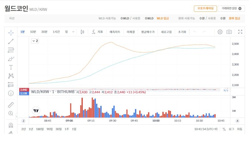 이날 오전 10시 30분 빗썸 기준 월드코인 가격은 전날 같은 시간보다 65.36% 오른 2487원에 거래되고 있다. 오전 9시 경에는 전날 대비 80%에 달하는 상승률을 보이기도 했다.