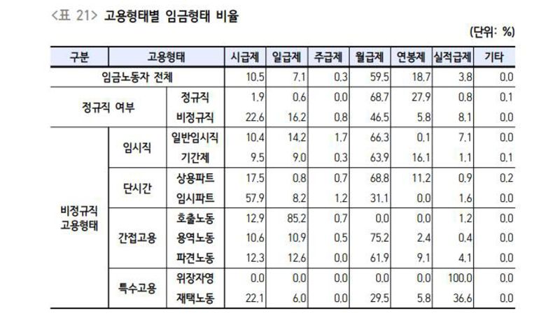 연구는 한국의 관행적인 월 1회 급여 지급 방식을 바꿀 것을 제안했다. 근로 조건이 불안정한 경우 생계 유지를 위해 현금이 자주 필요하기 때문이다. 연구자들이 올해 4월 근로자 300명을 대상으로 설문한 결과, 정규직 근로자의 95%가 월급제를 적용받고 있었으며 이 중 68%가 월급제를 선호했다. 반면 비정규직의 월급제 선호 비율은 41%에 그쳤고, 반월급제(17.9%)를 선호하는 비율이 높았다. 일용직은 월급제 선호가 45.5%였고 주급(22.7%) 선호가 가장 높았다.