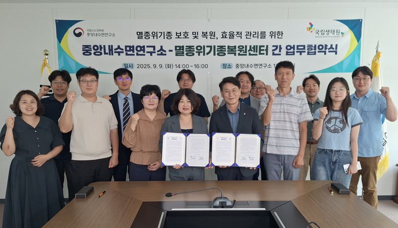 수과원 중앙내수면연구소는 지난 9일 오후 연구소 본원에서 생태원 멸종위기종복원센터와 ‘멸종위기종 보호와 복원, 공동 관리를 위한 업무협약’을 맺었다고 10일 밝혔다.