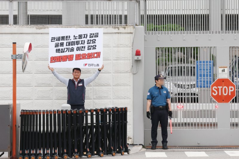 (서울=뉴스1) 신윤하 기자 = 전국민주노동조합총연맹(민주노총)이 미국 조지아주(州) 한국 배터리 공장 건설 현장에서 한국인 근로자 300여 명이 체포·구금됐던 사건과 관련해 주한미대사관 앞 1인 시위에 나섰다.