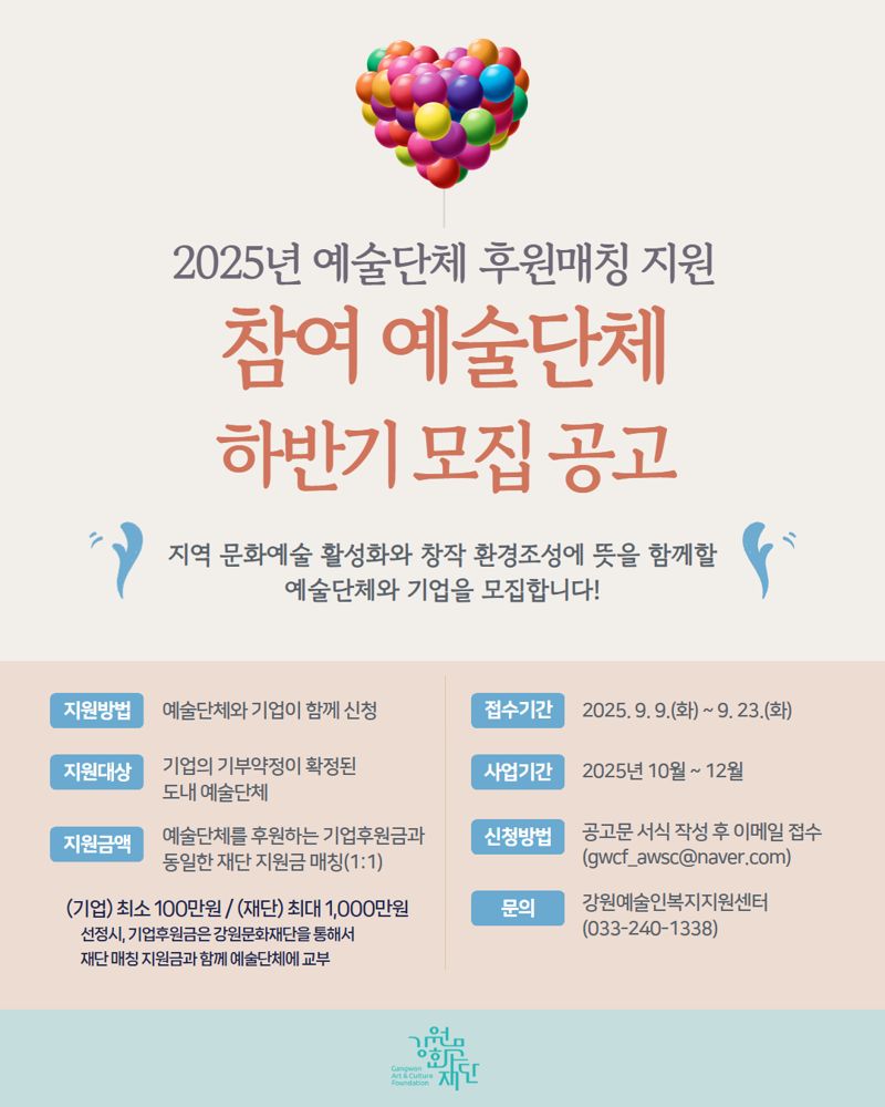 【파이낸셜뉴스 춘천=김기섭 기자】강원문화재단이 2025년 예술단체 후원매칭 지원사업 하반기 공모를 추진한다.