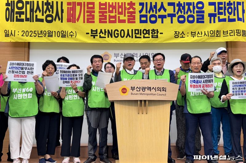 지역 시민단체 부산 NGO 시민연합은 10일 오전 부산시의회 브리핑실에서 기자회견을 열고 해운대구와 김성수 구청장에 즉각 신청사 공사 중단과 함께 토양성분조사 시행을 촉구했다.