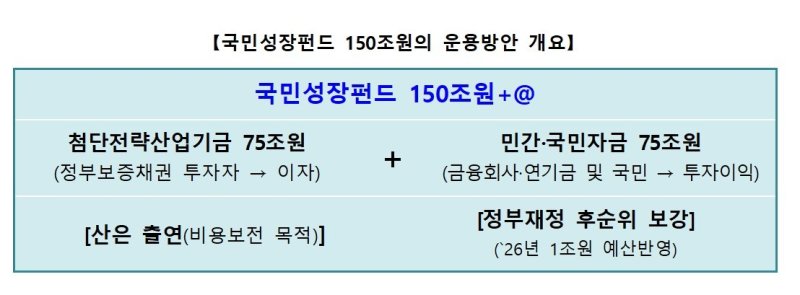 국민성장펀드 150조원은 첨단전략산업기금 75조원과 민간, 연기금, 금융회사, 국민 자금 75조원으로 구성된다. 산업은행이 우선 첨단전략산업기금 자금을 출연하고 재정이 후순위 참여로 민간자금 참여를 위한 마중물 역할을 하는 방식이다. 이와 관련 내년도 정부 예산안에 1조원이 반영됐다.
