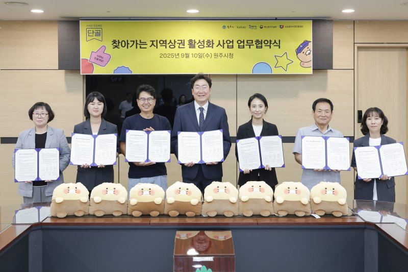 10일 원주시에 따르면 원주시와 카카오는 이날 오후 시청 회의실에서 ㈔함께만드는세상, 소상공인시장진흥공단, 도래미시장상인회, 자유시장번영회, 문화의거리상인회와 함께 '찾아가는 지역상권 활성화 사업'(카카오 프로젝트 단골) 업무협약을 맺었다.