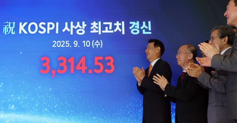 한국거래소에 따르면 이날 코스피 지수는 전 거래일 대비 1.67% 오른 3314.53를 기록했다. 코스피 지수의 역대 최고치는 종가 기준 3305.21(2021년 7월 6일)로 약 4년 2개월 만에 최고치를 경신했다.