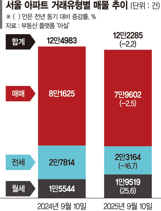 월세화 흐름은 거래량에서도 나타난다. 10일 대법원 등기정보광장에 따르면 올해 1~8월 전국 월세 거래는 120만952건으로 전년 동기 대비 25.8% 증가하며 처음으로 120만건을 넘어섰다. 전체 임대차 계약에서 월세 비중은 62.4%로, 2014년 통계 집계 이래 최고치를 기록했다. 이 같은 매물 구조 변화의 배경에는 정부의 강도 높은 대출 규제가 자리하고 있다. 실제로 시장 수급 불균형과 정책 효과가 동시에 작용하면서 매매는 적체되고, 전세 매물은 줄어드는 대신 월세 전환이 가속화됐다.