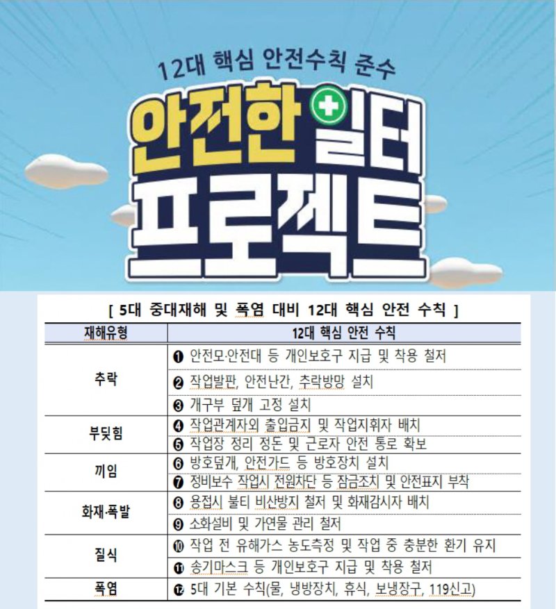 이 프로젝트는 추락, 부딪힘, 끼임, 화재·폭발, 질식 등 5대 중대재해 예방은 물론 여름철 폭염 피해까지 고려한 12대 핵심 안전수칙을 제시하고 현장에서 실천 가능한 지침을 구체화한 것이 특징이다.