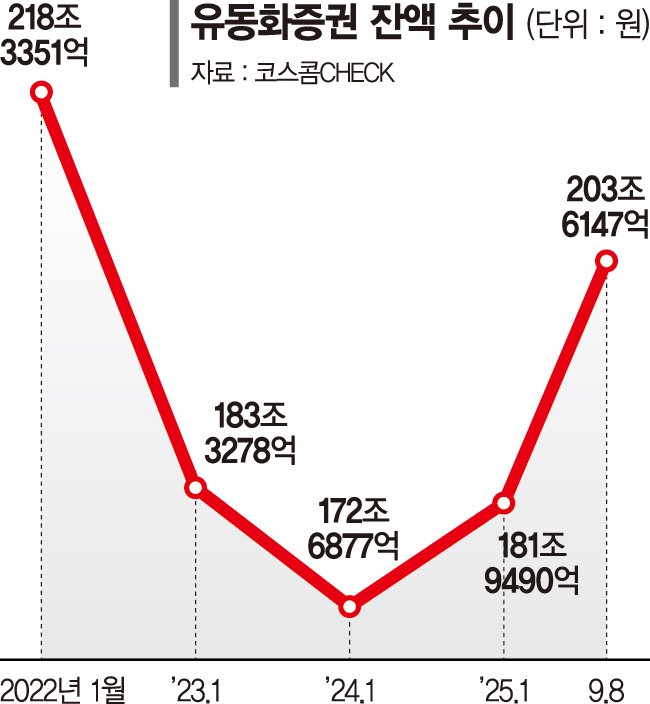 10일 코스콤CHECK에 따르면 지난 8일 기준 유동화증권의 잔액은 203조6147억원으로 올해 1월 초(181조9490억원) 대비 21조6657억원 증가했다.