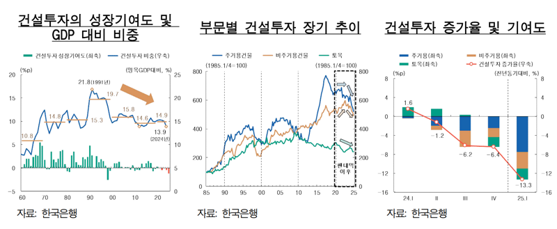 다만 2017년 이후 부동산 대출규제 강화, 금융여건 긴축 등으로 장기간 하강국면을 지속했다. 특히 2020년대 들어서는 팬데믹 초기 유동성 공급 확대 등으로 일시 반등했으나 이후 공사비 급등, 금리 상승, 부동산 가격 하락으로 수주·착공이 위축되고 부동산 프로젝트파이낸싱(PF)이 부실화됨에 따라 건설투자 부진이 심화됐다. 아울러 최근에는 국내 정치 불확실성 확대, 다수의 건설현장 안전사고에 따른 공사 차질 등 이례적 요인들도 부진 요인으로 가세했다.