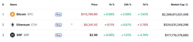 11일 오전 7시 40분 현재 글로벌 코인 시황 중계사이트인 코인마켓캡에서 비트코인은 24시간 전보다 2.09% 상승한 11만3790달러를 기록하고 있다.