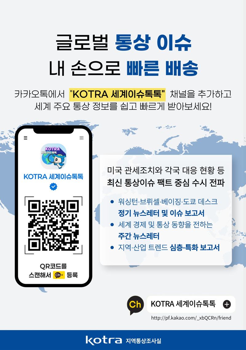 세계이슈톡톡은 코트라의 131개 해외무역관과 4개 주요국(미국, EU, 중국, 일본)의 통상 전문가들이 매일 발간하는 보고서와 뉴스레터를 모바일로 제공하는 채널이다.