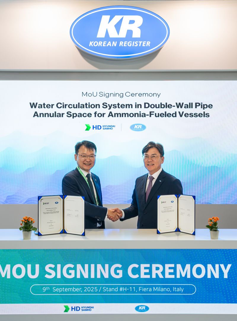 [파이낸셜뉴스] 한국선급(KR)은 이탈리아 밀라노에서 열리고 있는 ‘가스텍 2025’ 전시회에서 HD 현대삼호와 '암모니아 연료추진선박의 이중관 환형 공간 내 청수 순환시스템' 공동 개발을 위한 업무협약을 지난 9일(현지시간) 체결했다고 11일 밝혔다.