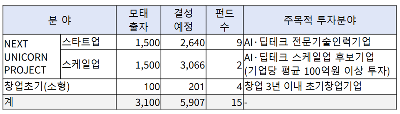 이번 2차 정시 출자사업의 핵심은 '넥스트 유니콘 프로젝트(NEXT UNICORN Project)다. 글로벌 인공지능(AI)·딥테크 기술패권 경쟁이 가속화되는 상황 속에서 국내 유망 벤처·스타트업이 창업 단계부터 스케일업까지 성장할 수 있도록 대규모 집중 투자를 지원하는 사업이다.