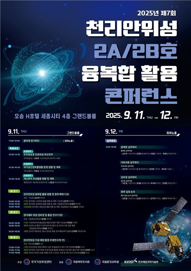 [파이낸셜뉴스] 환경부 소속 국립환경과학원은 11일부터 이틀간 청주시 흥덕구 에이치호텔 세종시티에서 ‘제7회 천리안위성 2호(2A·2B호) 융복합 활용 학술토론회(콘퍼런스)’를 개최한다고 밝혔다.
